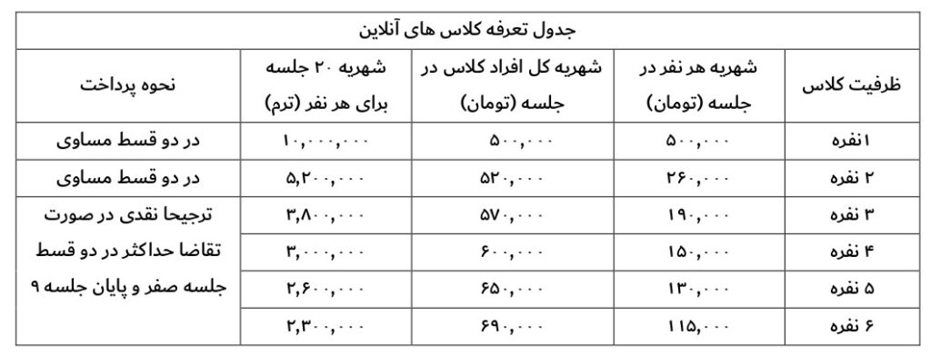 برای حفظ کیفیت تعداد افراد شرکتکننده در کلاسهای آنلاین بسیار کمتر از کلاسهای حضوری و حداکثر ۶ نفر تعریف شده است.
